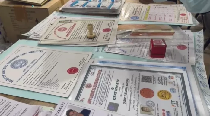 गुजरात के सूरत में फर्जी ‘बैचलर ऑफ इलेक्ट्रो-होम्योपैथी मेडिसिन एंड सर्जरी’ (बीईएमएस) डिग्री गिरोह का भंडाफोड़ होने के बाद 10 फर्जी चिकित्सकों समेत 14 लोगों को गिरफ्तार किया गया है. पुलिस ने बताया कि आरोपियों के “क्लीनिकों” से एलोपैथिक और होम्योपैथिक दवाइयां, इंजेक्शन, सिरप की बोतलें और प्रमाण पत्र बरामद किए गए हैं. पुलिस की ओर से जारी एक विज्ञप्ति में कहा गया है, ‘आरोपियों में से तीन 70,000 रुपये में फर्जी बीईएमएस डिग्रियां बेच रहे थे. उनकी पहचान सूरत के निवासी रसेश गुजराती, अहमदाबाद के रहने वाले बीके रावत और उनके सहयोगी इरफान सैयद के रूप में हुई है. हमारी प्रारंभिक जांच में पता चला कि गुजराती और रावत ‘बोर्ड ऑफ इलेक्ट्रो होम्योपैथिक मेडिसिन, अहमदाबाद’ की आड़ में गिरोह चला रहे थे.’